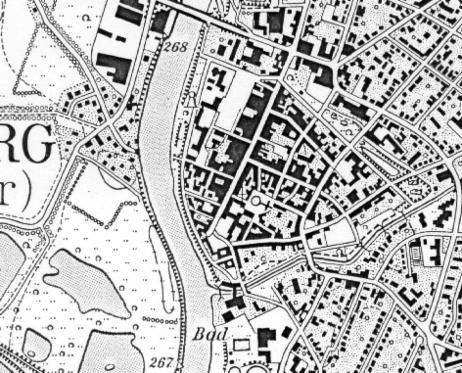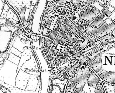 Illustr. 7 NIENBURG in 1899 The Plan of Nienburg shows the bridge of stone over the Weser (enlarged detail, scale app. 1:10.000, from the Prussian Map of 1899 shows the Nienburgian City and the little suburb on the west bank. You can recognise the bridge and its piers.