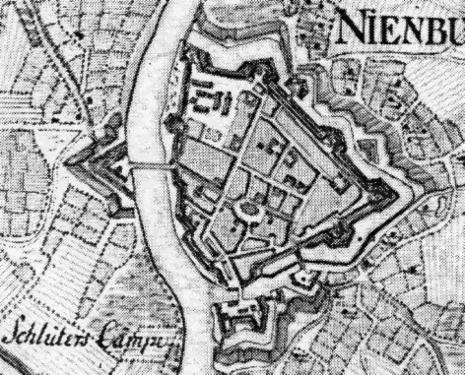 Plan of Nienburg showing the bridge of stone over the Weser (enlarged detail, scale app. 1:10.000, from the map of 1766 by the Chur Hanoverian Engineering Corps)