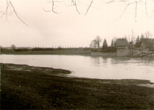 Illustr. 8 This picture shows the ravelin wall on the west bank a former pier of the Weser bridge in stone, mounted by a little garden house (after the footpassenger bridge was blown up in World War II). The was taken in 1958 by the author.