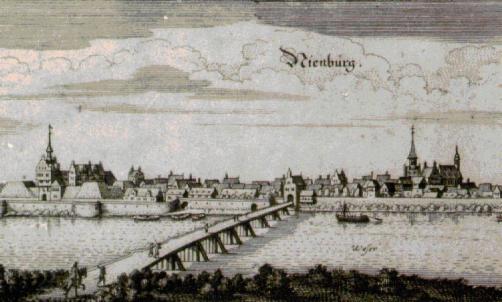 In former centuries the traffic crossing the river Weser was carried over by a ferry. The first bridge to be built across the Weser, was built in 1616 as a wooden "summer"-bridge. But this construction had to be dismantled every winter and reconstructed every spring because of heavy ice-drifts on the River Weser. For a short period after the end of the Thirty Years' War [11] a pontoon-bridge connected both banks of the river. But already in 1663 it had been replaced by a permanent wooden bridge.