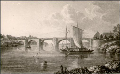 Illustr. 5 The engraving of 1827 by Captain R. Batty shows the view of the bridge as seen from the north after it was blown up by French soldiers retreating on 15th Octobere the middle arch being repaired by carpenters with a wooden construction.