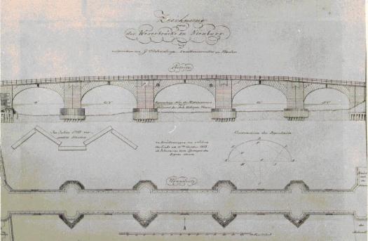 The layout of the bridge[13] was 420 foot length and 29 foot wide. The five arches of the bridge construction were oval shaped in order to avoid a greater height of the bridge. The arches (as seen symmetrically) did not exactly have the same widths. The middle arch had a width of 72 foot 7 inches, the second arch to the left 65 foot 3 inches, the second arch to the right side 64 foot. Of the smaller outer arches the left one had a width of 59 foot and the right one 53 foot 6 inches[14].